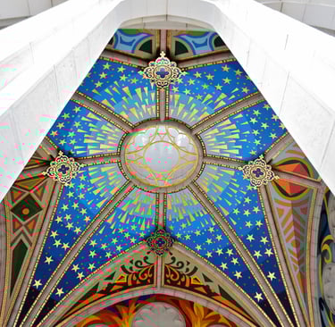 Back in Madrid, though, we spent most of our time doing what you inevitably do in grand European churches: looking up. Ceilings, frescoes, statues, arches — everything is designed to pull your gaze heavenward. This particular photo captures the upper dome and bell tower of Almudena Cathedral. Magnificent. Dramatic. Full of architectural confidence.