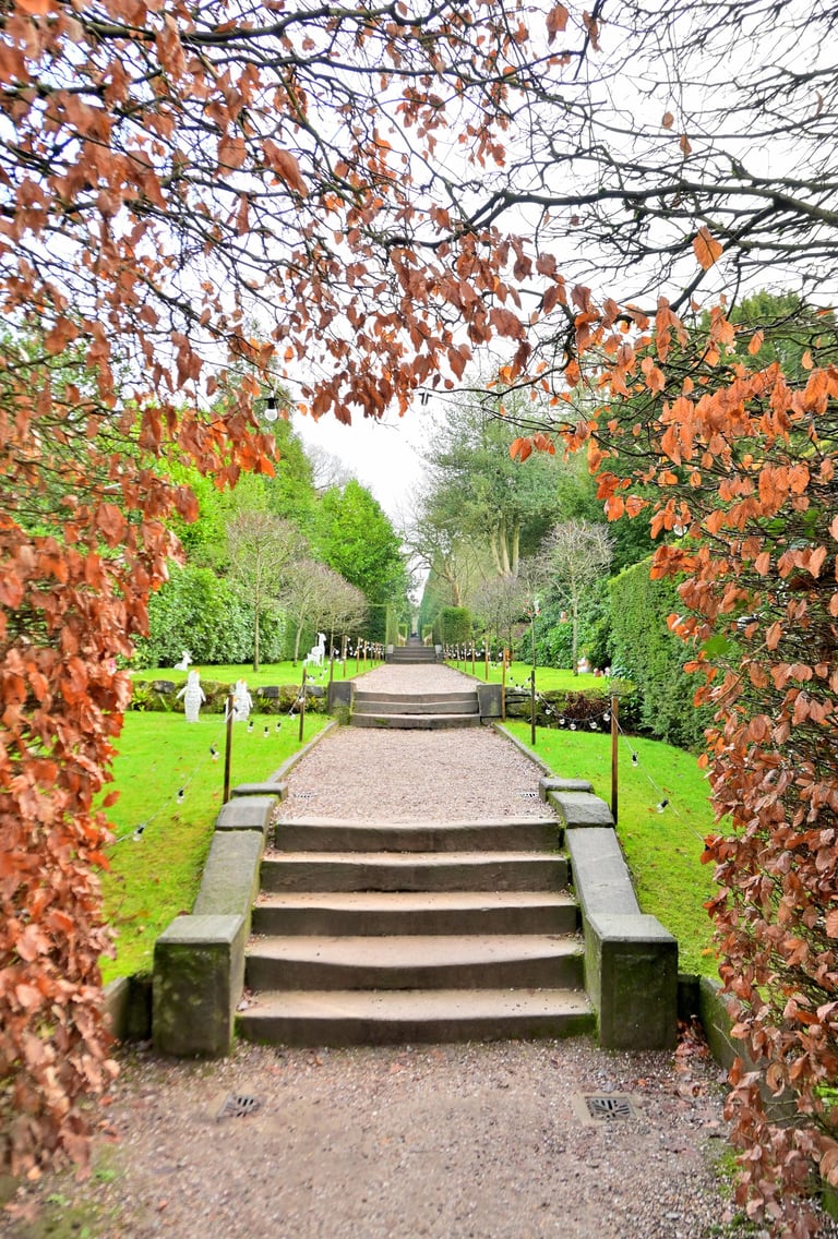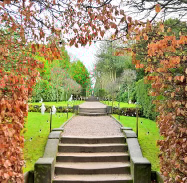 During my visit to Biduph Grange, I encountered a striking scene that perfectly encapsulated the essence of autumn, even under the muted grayness of the overcast sky. The long, straight path leading up Gendle Hill was framed exquisitely by trees and hedges, providing a serene contrast to the dreary weather. The path, bordered by an array of vivid autumn leaves, created a poignant reminder of the beauty that exists within the mundane.