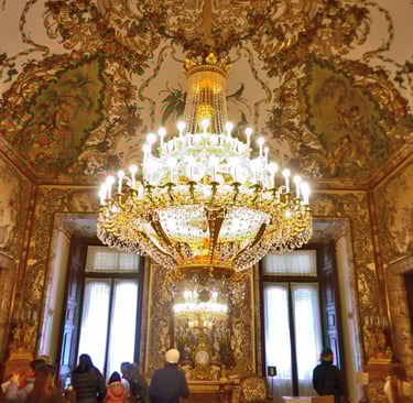Jumping back inside the Royal Palace of Madrid, this photo was taken in the spectacular Chamber of King Charles III — a room so ornate it feels like it’s showing off. Gold everywhere. Silk everywhere. Frescoes overhead that practically demand you stop and stare long enough to walk into something (more on that shortly).